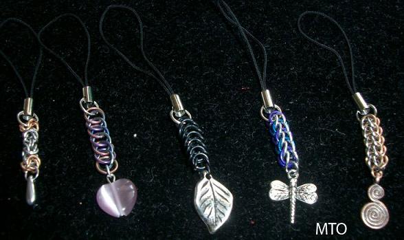 Half Persian cell phone charm in anodized titanium and completed with a glass heart bead. Box Weave in anodized aluminum and completed with a silver leaf; please specify your color preference when ordering. Full Persian cell phone charm in alternating bright and anodized aluminum rings to create a unique combiation of your own and is then finished with a dragonfly; please specify your color preference when ordering. Full Persian cell phone charm in alternating stainless steel and bronze rings and completed with a coordinating spiral bead.