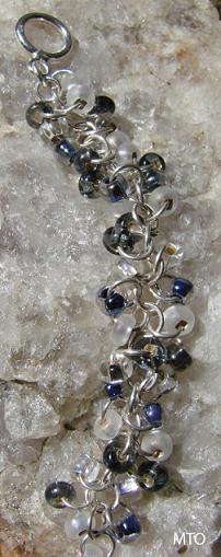 ![]() This 7.5” bracelet has a sterling silver toggle clasp, and combines sterling silver rings and glass beads to jingle ever so softly when worn. If you would like another color combination, please specify.