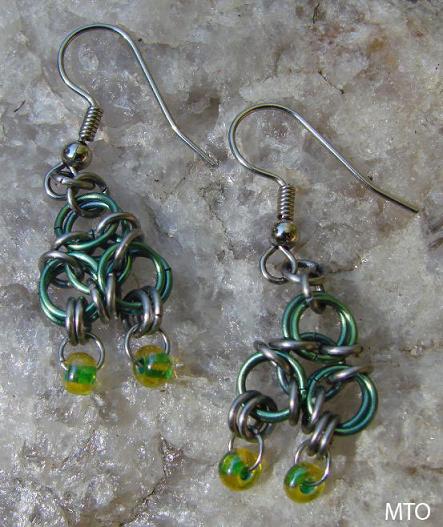 These earrings are made from the Aura weave in anodized niobium and stainless steel rings. They hang from stainless hooks and have green glass beads. Please specify if you would like other colors. Price: $30