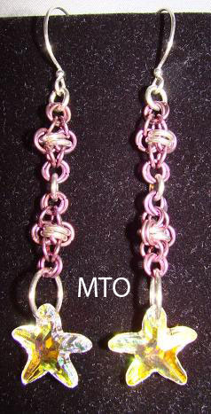 Ever since I got my anodizer, I've been having a blast seeing what I can create with it. These earrings are one result of it. The deep pink rings are anodized niobium and they are combined with sterling silver rings. The earrings are then completed with matching sterling silver earhooks and a SwarovskiŽ crystal starfish. They are long and light and a lot of fun to wear. Price: $50