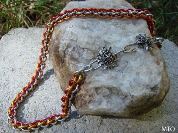 Despite the fact that fall is hard upon us, there are still flowers blooming and this necklace reminds us of that fact. It is made from bright and anodized aluminum rings and is completed with a two-flower hook clasp.