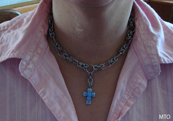 This necklace mixes small Byzantine units with large stainless steel connector rings and then has a short drop to hang the pretty little cross from.