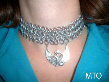 This pendant reminds me of a phoenix rising and I paired it with a 15” bright aluminum choker. It is very comfortable and light and makes for a nice conversation starter.