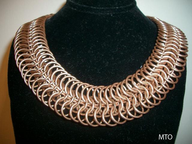 This necklace has a great weight and presence about it. I used the European 8in1 weave to make it very dense and then finished it with a bronze cleft clasp.