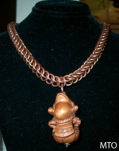 Doesn’t everyone love a sumo wrestling frog? I found this guy and wanted to spotlight him, so I wove a Half-Persian copper necklace with a copper lobster clasp and added him as a pendant.