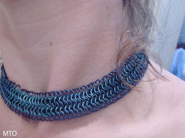 This necklace is crafted in the European 6in1 weave using 2 different shades of anodized titanium. The necklace is choker length and is finished with a matching titanium lobster clasp.