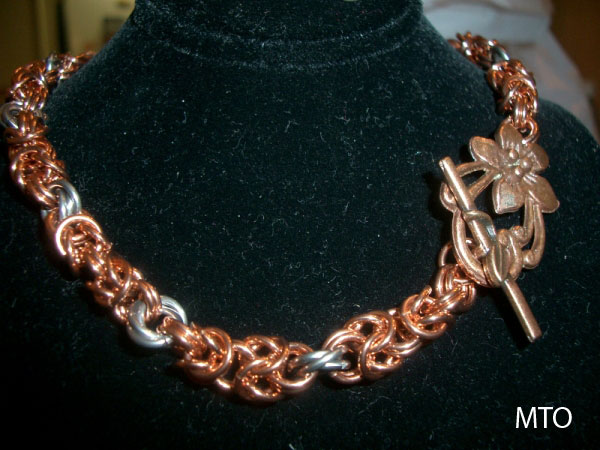 | HOME About Mailled To Order FAQ Bracelets And Anklets Necklaces Earrings Jewelry Sets Accessories Commission Gallery Materials & Tools Back | ![]() This 17” necklace has copper Byzantine units that are joined by stainless steel Mobius rings and is closed with a copper flower toggle clasp.