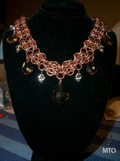 This necklace is 17” long and uses a modification of the Byz to Bees weave. There are 6 small topaz beads, 4 medium topaz pendants and 1 large topaz Swarovski focal pendant; the necklace is completed with a copper toggle clasp.